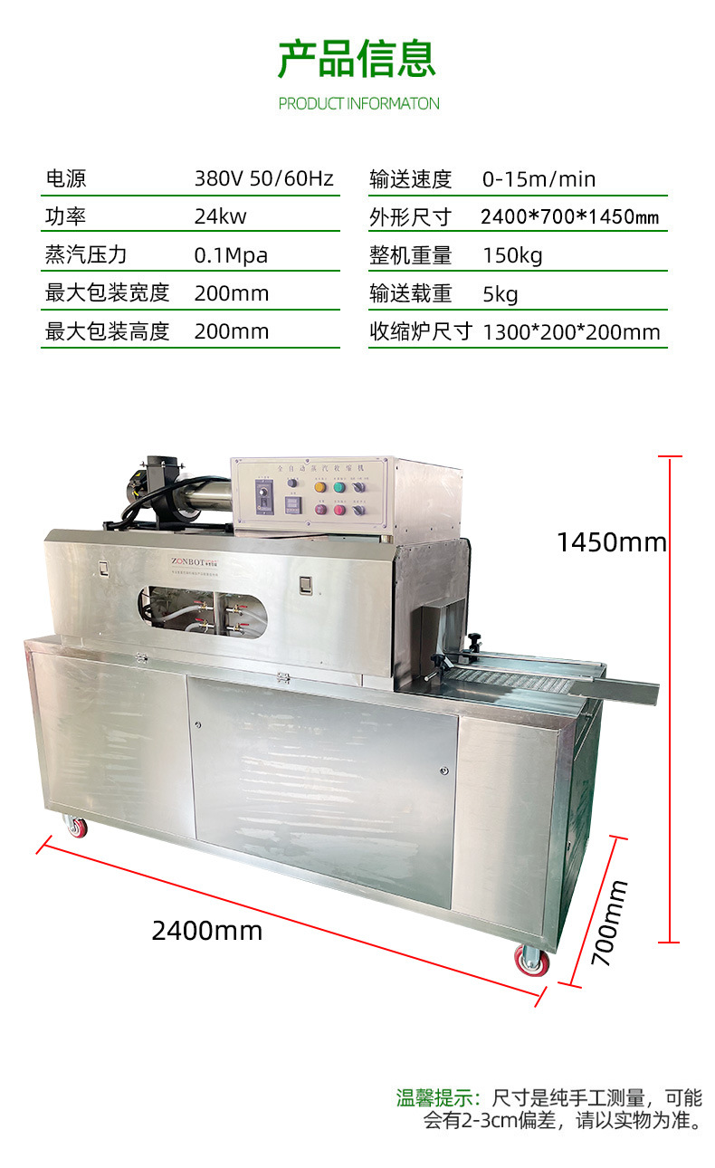 • 收縮均勻緊密:利用蒸汽恒溫且溫度擴散均勻的特性,使包裝薄膜能夠均勻受熱收縮,緊密地貼合在產品表面,有效減少褶皺產生,對于不同形狀的產品,如圓瓶、方瓶、扁瓶等各種不規則瓶形,都能達到理想的收縮效果,使包裝外觀更加平整、美觀123.