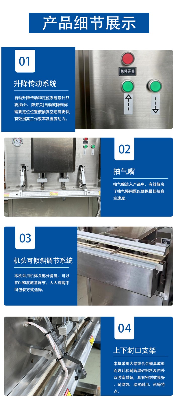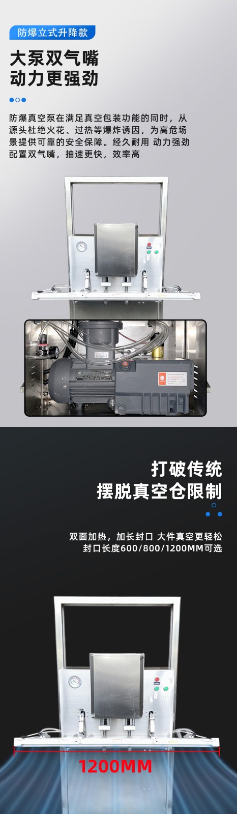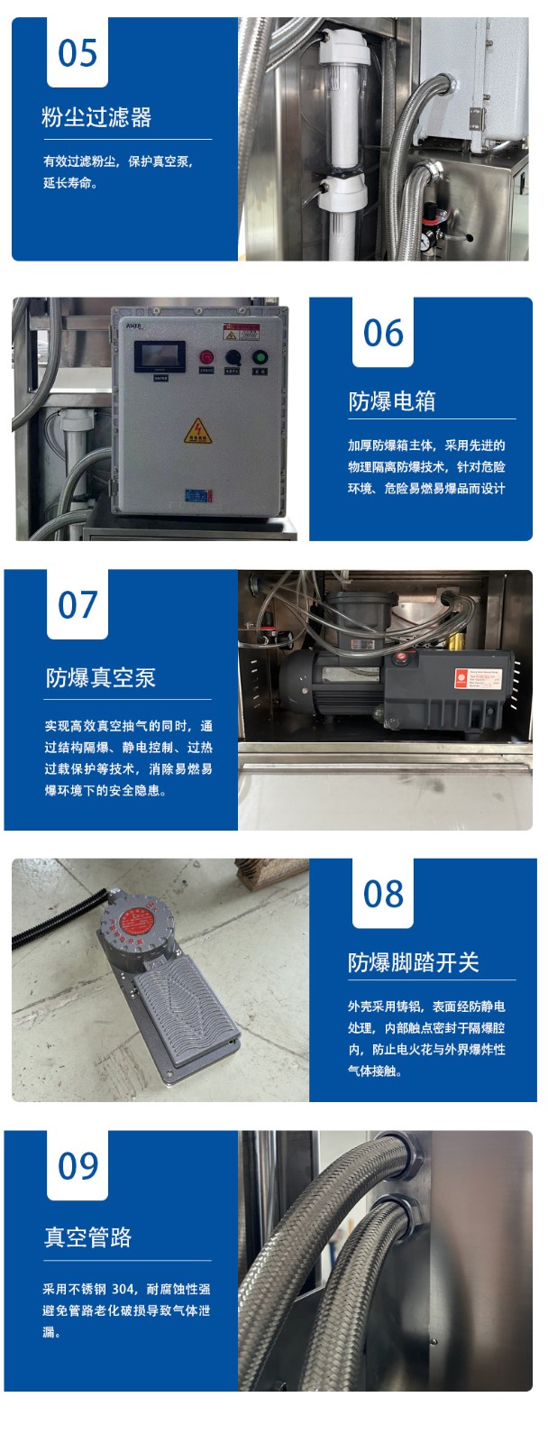 立式防爆真空包裝機(jī)的防爆配置集中在電氣、動(dòng)力及密封過濾等關(guān)鍵部件,以此適配易燃易爆的特殊工況,其適用工廠也多為存在爆炸隱患的化工、醫(yī)藥等領(lǐng)域,具體如下: