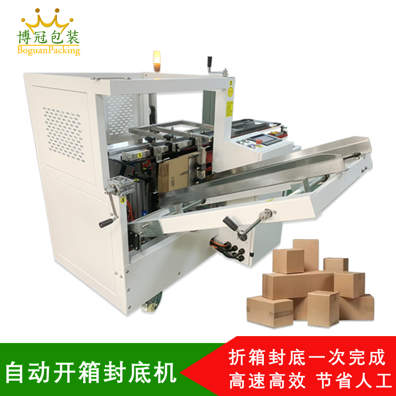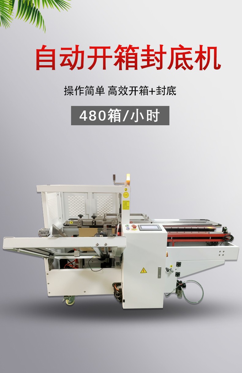 自動開箱封底機一次完成紙箱吸箱、開箱、成型、折底、封底等包裝工序,可大大減少生產人員和勞動強度。