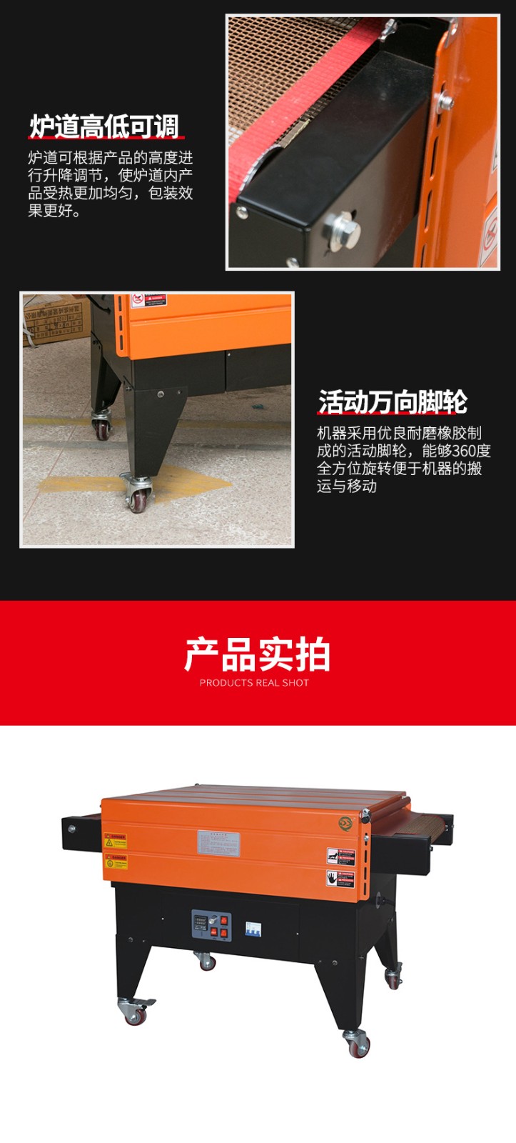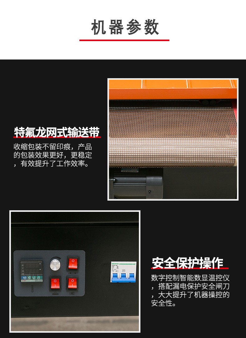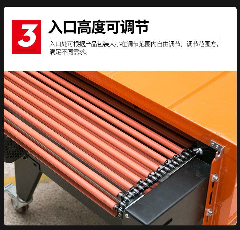 • 用于傳送需要包裝的產品。通常是由輸送帶組成,輸送帶的速度也可以調節。這使得不同尺寸和包裝速度要求的產品都能在機器中順利通過。比如,對于小型的文具產品,輸送帶可以以較慢的速度運行,保證熱收縮包裝的質量;而對于批量較大的食品包裝,可以加快輸送帶速度,提高包裝效率。