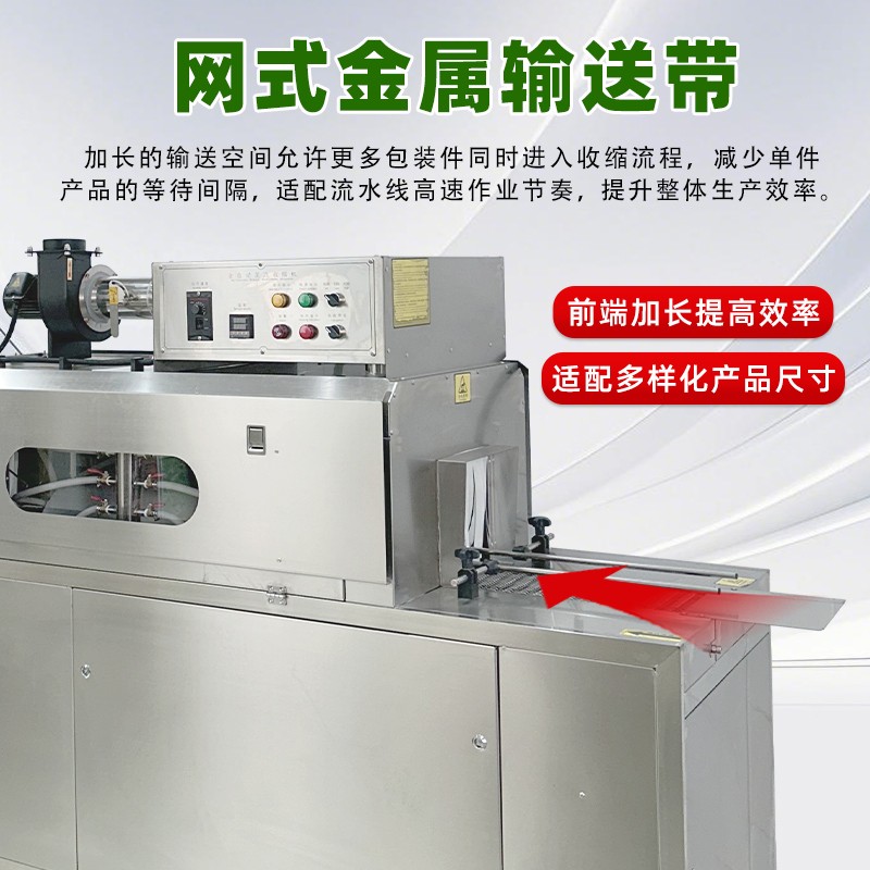 - 智能控溫,適配多類膜材配備 PLC 智能控制系統,可精準調節蒸汽溫度(50℃-120℃可調)、輸送速度與蒸汽噴射量,兼容 POF、PVC、PE 等多種熱收縮膜材,滿足不同產品的包裝厚度與質感要求。